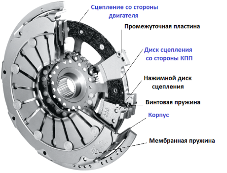 Стандартное сцепление на большинстве автомобилей с механической коробкой передач включает следующие основные компоненты:
