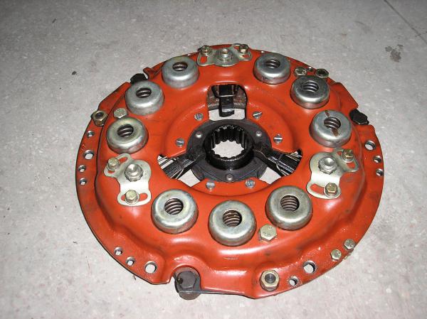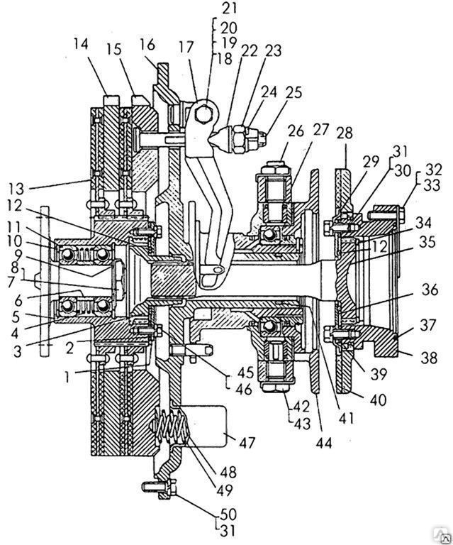 В ведущую часть входит кожух сцепления и маховик, последний в свою очередь крепится к маховику коленчатого вала за счет шести специальных болтов. Нажимной диск размещается в средней части кожуха. Вращающий момент нажимного диска передается от маховика через три выступления, которые имеются в диске и входят в окна кожуха. Ведомый диск, ступица, ведущий вал коробки смены передач являются основными и обязательными составными ведомой части сцепления.