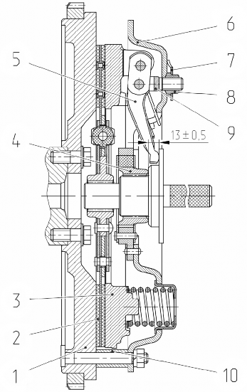 Нажимные диски 5 и 7 подвижно соединены с маховиком 1 (на схеме не показано). Нажимное усилие на поверхностях трения ФС создается пружинами б, которые могут быть винтовыми цилиндрическими (вариант А) или тарельчатыми (вариант Б).