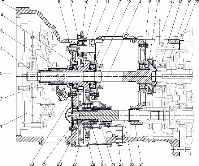 Характерной особенностью ФС, помимо раздельного управления и наличия двух самостоятельных приводов управления 9 и 14, является наличие двух независимых друг от друга комплектов фрикционных дисков: