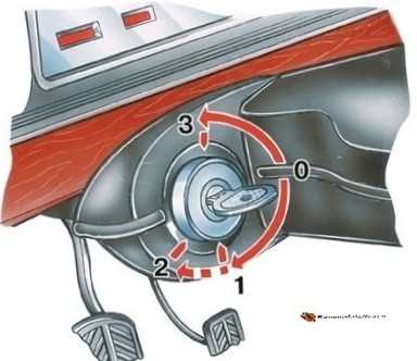 ΠΠΎΠ³Π΄Π° Π²ΡΡΠ°Π²Π»ΡΠ΅ΡΡΡ ΠΊΠ»ΡΡ Π² Π·Π°ΠΌΠΎΠΊ ΠΈ ΠΏΡΠΎΠ²ΠΎΡΠ°ΡΠΈΠ²Π°Π΅ΡΡΡ ΠΏΠΎ ΡΠ°ΡΠΎΠ²ΠΎΠΉ ΡΡΡΠ΅Π»ΠΊΠ΅, ΡΠΎΠ΅ΡΡΡ ΠΏΠ΅ΡΠ΅Ρ ΠΎΠ΄ΠΈΡ ΠΈΠ· Β«ΠΠ»ΠΎΠΊΠΈΡΠΎΠ²ΠΊΠΈΒ» Π² ΠΏΠΎΠ»ΠΎΠΆΠ΅Π½ΠΈΠ΅ Β«ΠΠΊΠ»ΡΡΠ΅Π½ΠΎΒ» (Β«ONΒ»), ΡΠΎΠ³Π΄Π° ΠΈ Π²ΠΊΠ»ΡΡΠ°ΡΡΡΡ Π²ΡΠ΅ ΠΎΡΠ½ΠΎΠ²Π½ΡΠ΅ ΡΠ»Π΅ΠΊΡΡΠΈΡΠ΅ΡΠΊΠΈΠ΅ ΡΠ΅ΠΏΠΈ Π°Π²ΡΠΎΠΌΠΎΠ±ΠΈΠ»Ρ, ΡΠ°ΠΊΠΈΠ΅ ΠΊΠ°ΠΊ: ΠΎΡΠ²Π΅ΡΠ΅Π½ΠΈΠ΅, ΡΡΠ΅ΠΊΠ»ΠΎΠΎΡΠΈΡΡΠΈΡΠ΅Π»Ρ, ΠΎΡΠΎΠΏΠΈΡΠ΅Π»Ρ ΠΈ Π΄ΡΡΠ³ΠΈΠ΅. ΠΠ½ΠΎΡΡΡΠ°Π½Π½ΡΠ΅ Π°Π²ΡΠΎ ΡΡΡΡΠΎΠ΅Π½Ρ Π½Π΅ΠΌΠ½ΠΎΠ³ΠΎ ΠΏΠΎ Π΄ΡΡΠ³ΠΎΠΌΡ, Ρ Π½ΠΈΡ ΡΡΠ°Π·Ρ ΠΏΠ΅ΡΠ΅Π΄ ΠΏΠΎΠ»ΠΎΠΆΠ΅Π½ΠΈΠ΅ΠΌ Β«ONΒ» ΡΡΠΎΠΈΡ Β«ΠΡΡΒ», ΡΠ°ΠΊΠΈΠΌ ΠΎΠ±ΡΠ°Π·ΠΎΠΌ Π΄ΠΎΠΏΠΎΠ»Π½ΠΈΡΠ΅Π»ΡΠ½ΠΎ Π΅ΡΠ΅ Π·Π°ΠΏΡΡΠΊΠ°Π΅ΡΡΡ ΠΌΠ°Π³Π½ΠΈΡΠΎΠ»Π°, ΠΏΡΠΈΠΊΡΡΠΈΠ²Π°ΡΠ΅Π»Ρ ΠΈ ΡΠ²Π΅Ρ Π² ΡΠ°Π»ΠΎΠ½Π΅. ΠΡΠ»ΠΈ ΠΊΠ»ΡΡ ΠΏΡΠΎΠ²Π΅ΡΠ½ΡΡΡ Π΅ΡΠ΅ ΠΏΠΎ ΡΠ°ΡΠΎΠ²ΠΎΠΉ ΡΡΡΠ΅Π»ΠΊΠ΅, ΡΠΎ Π·Π°ΠΌΠΎΠΊ ΠΏΠ΅ΡΠ΅ΠΉΠ΄Π΅Ρ Π² ΠΏΠΎΠ»ΠΎΠΆΠ΅Π½ΠΈΠ΅ Β«Π‘ΡΠ°ΡΡΠ΅ΡΒ», Π² ΡΡΠΎΡ ΠΌΠΎΠΌΠ΅Π½Ρ Π΄ΠΎΠ»ΠΆΠ½ΠΎ ΠΏΠΎΠ΄ΠΊΠ»ΡΡΠΈΡΡΡΡ ΡΠ΅Π»Π΅ ΠΈ Π·Π°ΠΏΡΡΡΠΈΡΡΡΡ Π΄Π²ΠΈΠ³Π°ΡΠ΅Π»Ρ. ΠΠ°Π½Π½ΠΎΠ΅ ΠΏΠΎΠ»ΠΎΠΆΠ΅Π½ΠΈΠ΅ Π½Π΅ ΠΌΠΎΠΆΠ΅Ρ Π±ΡΡΡ Π·Π°ΡΠΈΠΊΡΠΈΡΠΎΠ²Π°Π½ΠΎ, ΠΏΠΎΡΠΎΠΌΡ ΡΡΠΎ ΡΠ°ΠΌ ΠΊΠ»ΡΡ ΡΠ΄Π΅ΡΠΆΠΈΠ²Π°Π΅Ρ Π²ΠΎΠ΄ΠΈΡΠ΅Π»Ρ. ΠΠΎΡΠ»Π΅ ΡΡΠΏΠ΅ΡΠ½ΠΎΠ³ΠΎ Π·Π°ΠΏΡΡΠΊΠ° ΠΌΠΎΡΠΎΡΠ° ΠΊΠ»ΡΡ Π²ΠΎΠ·Π²ΡΠ°ΡΠ°Π΅ΡΡΡ Π² ΠΈΡΡ ΠΎΠ΄Π½ΠΎΠ΅ ΠΏΠΎΠ»ΠΎΠΆΠ΅Π½ΠΈΠ΅ Β«ΠΠ°ΠΆΠΈΠ³Π°Π½ΠΈΠ΅Β» β Β«ONΒ» ΠΈ ΡΠΆΠ΅ Π² ΡΡΠΎΠΌ ΡΠΎΡΡΠΎΡΠ½ΠΈΠΈ ΠΊΠ»ΡΡ ΡΠΈΠΊΡΠΈΡΡΠ΅ΡΡΡ Π² ΠΎΠ΄Π½ΠΎΠΌ ΠΏΠΎΠ»ΠΎΠΆΠ΅Π½ΠΈΠΈ Π΄ΠΎ ΠΏΠΎΠ»Π½ΠΎΠΉ ΠΎΡΡΠ°Π½ΠΎΠ²ΠΊΠΈ ΠΌΠΎΡΠΎΡΠ°. ΠΡΠ»ΠΈ ΠΆΠ΅ Π½Π΅ΠΎΠ±Ρ ΠΎΠ΄ΠΈΠΌΠΎ Π·Π°Π³Π»ΡΡΠΈΡΡ ΠΌΠΎΡΠΎΡ, ΡΠΎ Π² ΡΠ°ΠΊΠΎΠΌ ΡΠ»ΡΡΠ°Π΅ ΠΊΠ»ΡΡ ΠΏΡΠΎΡΡΠΎ ΠΏΠ΅ΡΠ΅Π²ΠΎΠ΄ΠΈΡΡΡ Π² ΠΏΠΎΠ»ΠΎΠΆΠ΅Π½ΠΈΠ΅ Β«ΠΡΠΊΠ»ΡΡΠ΅Π½ΠΎΒ», ΡΠΎΠ³Π΄Π° Π²ΡΠ΅ ΡΠ΅ΠΏΠΈ ΠΏΠΈΡΠ°Π½ΠΈΡ ΠΎΡΠΊΠ»ΡΡΠ°ΡΡΡΡ ΠΈ Π΄Π²ΠΈΠ³Π°ΡΠ΅Π»Ρ ΠΎΡΡΠ°Π½Π°Π²Π»ΠΈΠ²Π°Π΅ΡΡΡ.