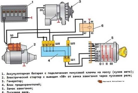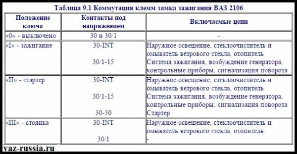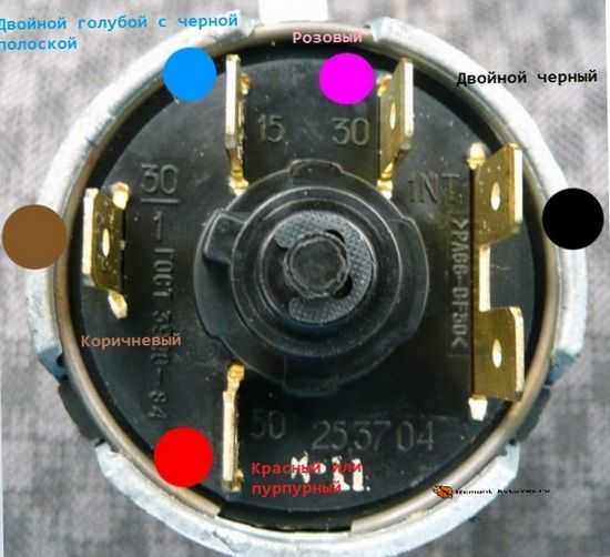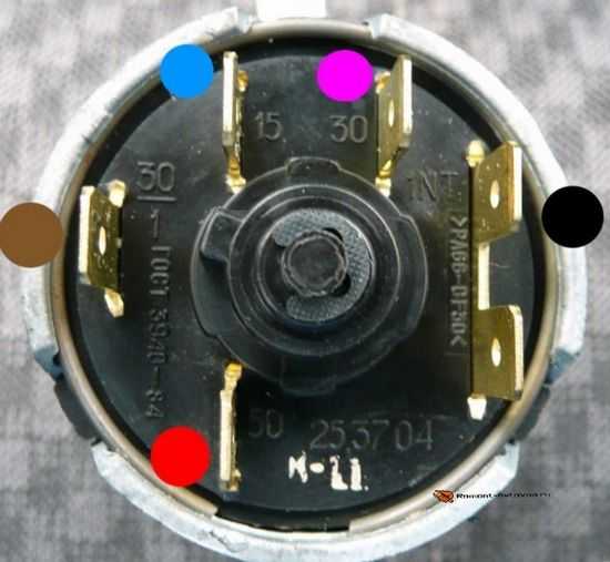 Π΅ΠΌΠ° ΠΏΠΎΠ΄ΠΊΠ»ΡΡΠ΅Π½ΠΈΡ Π·Π°ΠΌΠΊΠ° Π·Π°ΠΆΠΈΠ³Π°Π½ΠΈΡ ΠΠΠ 2101-2107 — 50 β ΠΊΡΠ°ΡΠ½ΡΠΉ (Π·Π°ΠΏΡΡΠΊ ΡΡΠ°ΡΡΠ΅ΡΠ°), 15 β ΡΠΈΠ½ΠΈΠΉ Ρ ΡΡΡΠ½ΠΎΠΉ ΠΏΠΎΠ»ΠΎΡΠΊΠΎΠΉ (Π·Π°ΠΆΠΈΠ³Π°Π½ΠΈΠ΅, ΠΏΠ΅ΡΠΊΠ°, ΠΎΡΡΠ°Π»ΡΠ½ΡΠ΅ ΠΏΡΠΈΠ±ΠΎΡΡ ΠΏΡΠΈ Π²ΠΊΠ»ΡΡΠ΅Π½ΠΈΠΈ Π·Π°ΠΆΠΈΠ³Π°Π½ΠΈΡ), 30/1 β ΠΊΠΎΡΠΈΡΠ½Π΅Π²ΡΠΉ , INT β ΡΡΡΠ½ΡΠΉ (ΠΏΠΈΡΠ°Π½ΠΈΠ΅ Π½Π° Π³Π°Π±Π°ΡΠΈΡΡ ΠΈ ΡΠ°ΡΡ), 30 β ΡΠΎΠ·ΠΎΠ²ΡΠΉ. Π€ΠΎΡΠΎΠ³ΡΠ°ΡΠΈΡ 10.