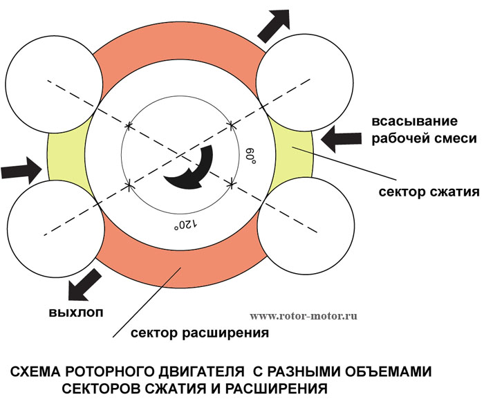 В классическом четырехтактным двигателем одно и то же цилиндр используется для различных операций — впрыск, сжатие, сжигание и выпуска. В роторном же двигателе каждый процесс выполняется в отдельном отсеке камеры. Эффект мало чем отличается от разделения цилиндра на четыре отсека для каждой из операций.