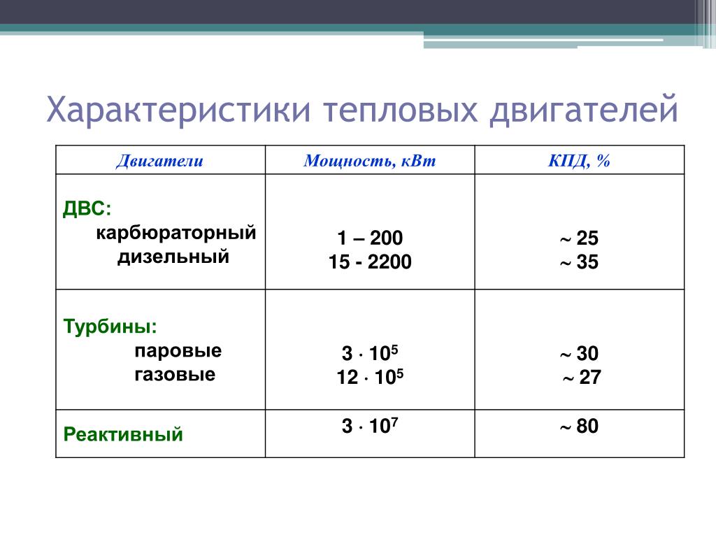 Его значение составляет 40 – 45%. Для сравнения, у поршневых двигателей внутреннего сгорания КПД составляет 25%, у современных турбодизелей – около 40%. Самый высокий КПД у поршневых дизельных двигателей составляет 50%. До настоящего времени ученые продолжают работу по изысканию резервов для повышения КПД двигателей.