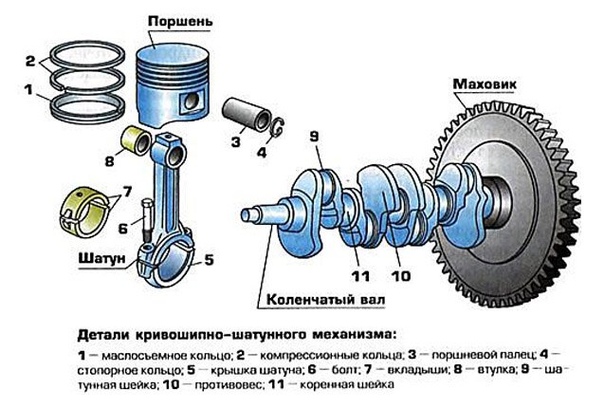 а) коленчатый вал, маховик, поршень, поршневые кольца, шатун, коренные подшипники