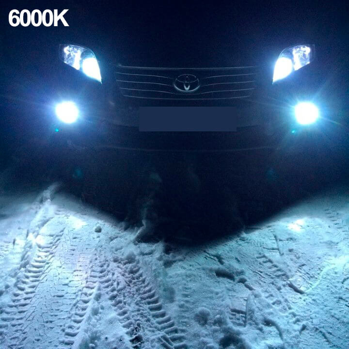 - 6000К холодный белый яркий, который выбирают многие покупатели за красоту света, но в плохую погоду, вам может не хватать освещения с подобными лампами;