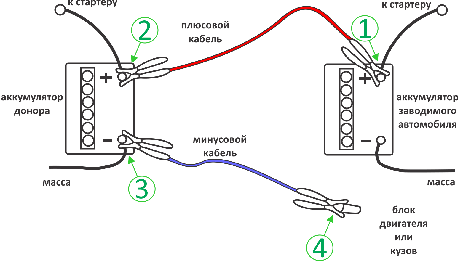 На машине-доноре мотор обязательно должен быть выключен, и с аккумулятора снята хотя бы минусовая клемма. Это обеспечивает полное разделение электросетей обоих автомобилей, при котором «реципиент» питается от удаленного аккумулятора, а исправный автомобиль просто стоит без батареи.