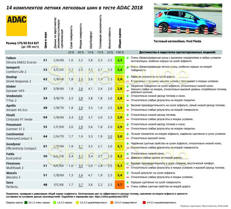 Испытанные летние шины получают баллы, установленные испытательной организацией, в следующих категориях :