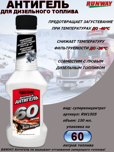 С зимним дизелем он обеспечивает уверенный запуск мотора при температуре до -51 градуса Цельсия. А с летним топливом состав позволяет силовому агрегату запуститься при температуре до -27 градусов. Кроме того, средство препятствует засорению форсунок и обеспечивает уверенную работу двигателя в любых условиях.
