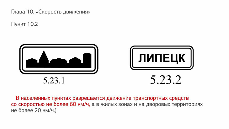 10.2. В населенных пунктах разрешается движение транспортных средств со скоростью не более 60 км/ч, а в жилых зонах и на дворовых территориях не более 20 км/ч.