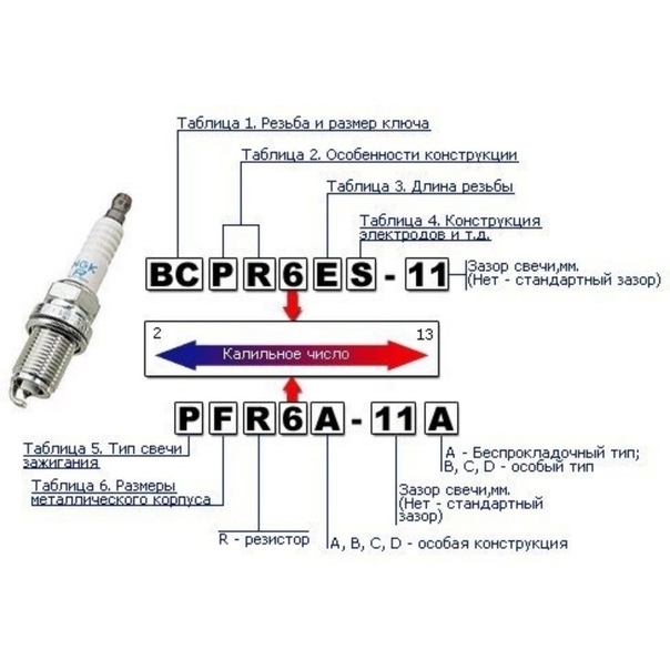 Далее идет маркировка калильного числа, условно идущая от 6 (самые «холодные» свечи) до 13 (самые «горячие»). Обратите внимание, что шкала «обратная» относительно отечественного ГОСТа, где меньший индекс соответствует «горячим» свечам, а больший – «холодным».