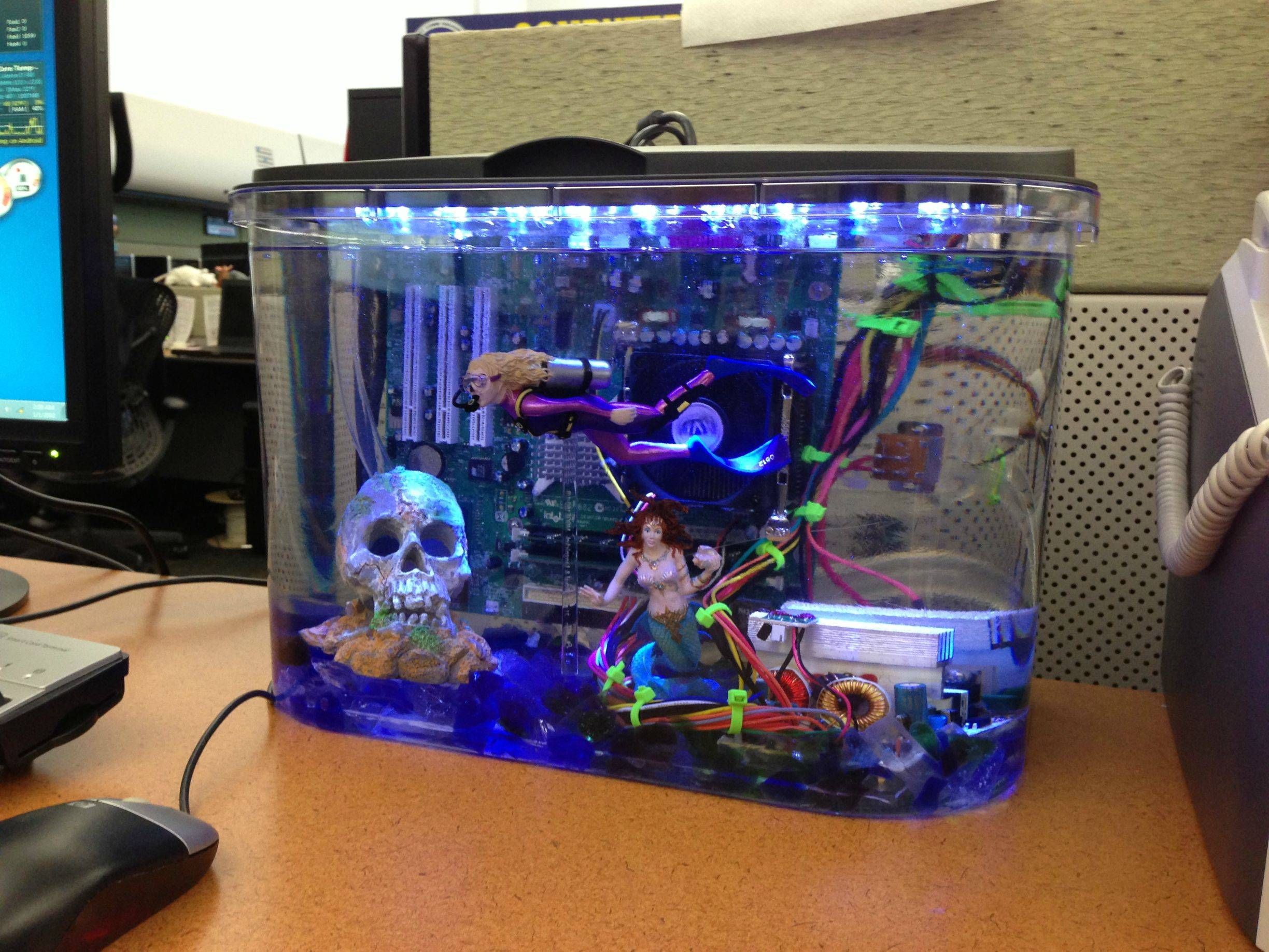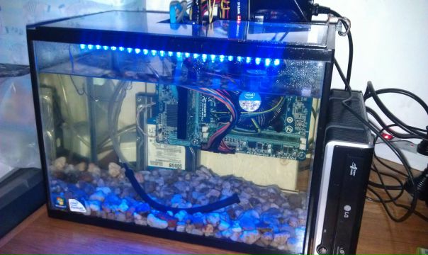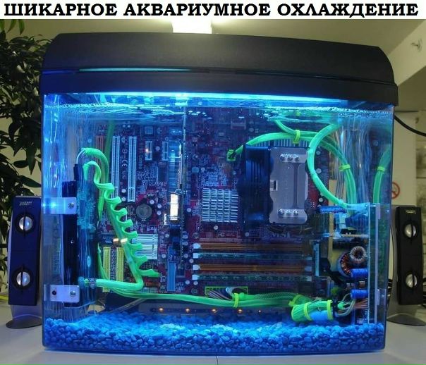 Всё меняется, если весь компьютер погрузить в масло — это позволит охладить не только его отдельные составляющие, но и весь корпус. Масло не проводит электричество, и погружение в него компонентов ПК абсолютно безопасно. В масло нельзя окунать только жесткие диски и приводы оптических дисков.