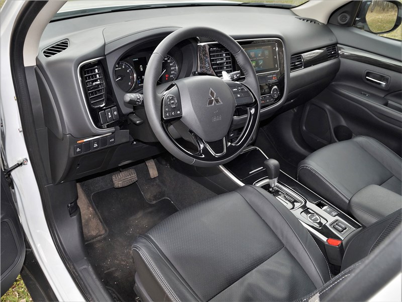 Обновленный Mitsubishi Outlander – это все про комфорт: мягко, тихо, плавно. В таком режиме и 2,4-литровый мотор на 167 л.с. не досаждает звуком, но зато неплохо тянет на 2-3 тыс. об/мин., и «автомат»-вариатор дарит плавность движения. К слову: вариатор Jatco CVT8 немного обновлен – был расширен силовой диапазон (с 6,0 до 7,0) и снижены потери на трение. Кроме подрулевых переключателей для вариатора также предусмотрен силовой L-режим (будто постоянно включена 1-2 передача): пригодится при буксовании в грязи/снегу или при необходимости торможения двигателем на склонах.