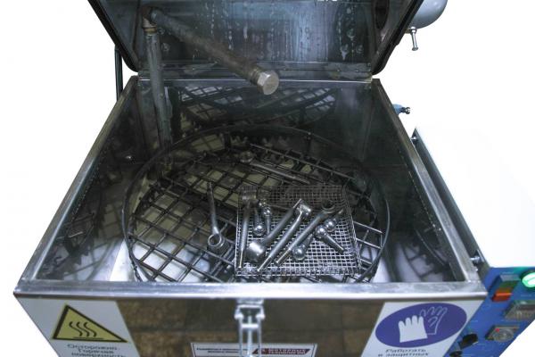 Над крышкой (или в ней) также по бокам, находятся моющие форсунки, которые распыляют специальные составы под давлением. Деталь в сетке может вращаться.