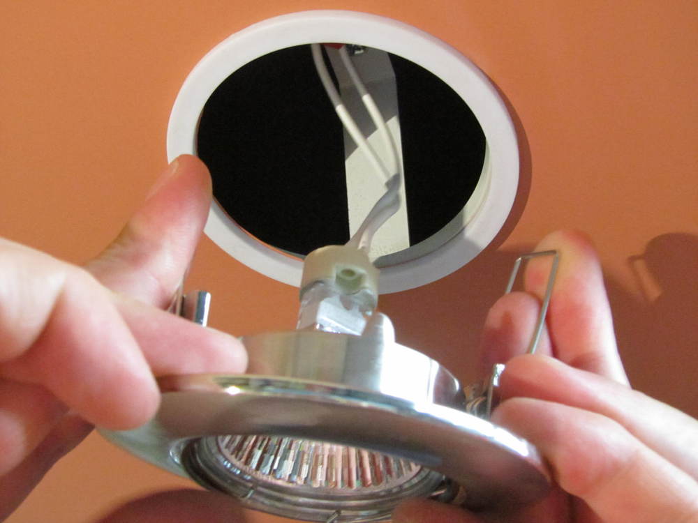 С панелями из гипсокартона еще легче работать. В материале вырезается отверстие равное диаметру светильника. Делать его желательно кольцевым сверлом. Затем на корпусе светильника сжимаются фиксирующие пружины, и он вставляется в отверстие до упора и отпускается. Пружины расходятся, и устройство надежно фиксируется на месте.