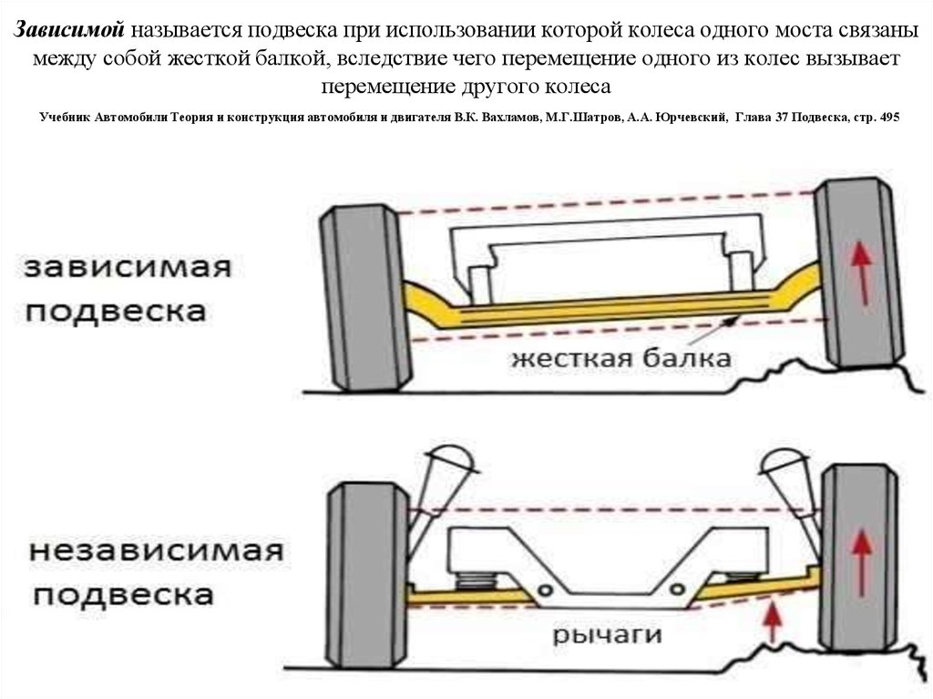 Задняя подвеска бывает зависимая(в этом случае задние колеса очень плотно друг с другом связаны и совершают похожие движения по вертикали), полузависимая(в таком случае связь между колесами не так сильна и они в определенных пределах могут двигаться независимо друг от друга) и независимая(как понятно из названия, задние колеса никак не связаны друг с другом и могут совершать несинхронные движения). Однако даже самую сильную независимость сглаживает специальная деталь — стабилизатор. Его задачей является синхронизация колес в случае кренов. Если машина начала кренииться налево, при этом левое колесо уходит глубже в арку, а стабилизатор тащит туда же правое колесо, что препятствует крену и дальнейшему перевороту автомобиля. Стабилизаторы ставятся на передние подвески, а так же на задние подвески, если задняя подвеска независимая.