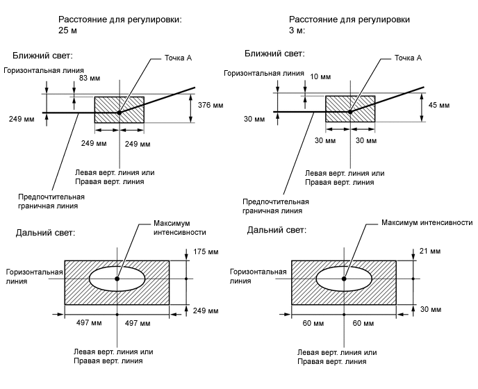 В некоторых случаях необходимо полностью заправить бак и установить груз равный весу водителя на водительское сидение. Правильная настройка света возможна только при соблюдении всех требований.
