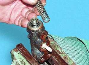 Для разборки ГТЦ слейте с него жидкость, затем аккуратно зажмите в тисках таким образом, чтобы отверстия для установки бачка оказались внизу. Открутите стопорные винты, которые не позволяют поршням возвращаться излишне далеко. Извлеките ГТЦ из тисков и с помощью съемника снимите стопорное кольцо со стороны ВУТ. Вытащите первый поршень и пружину. Нередко второй поршень выходит с трудом, поэтому приходится или стучать ГТЦ по деревянному бруску, или глушить одно из отверстий дальнего цилиндра с помощью подходящего болта и подключать ко второму отверстию компрессор с давлением не меньше 6 атмосфер. Вытаскивая поршни, обязательно запоминайте, как установлены резиновые уплотнители и как расположены поршни, это очень поможет при сборке.