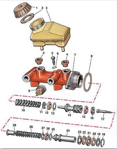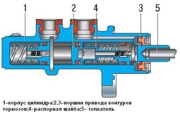 Внутри корпуса проделана полость, и каналы для соединения с трубопроводами (ведущими на тормозные механизмы), и бачком, откуда подается жидкость. В этой полости помещены два поршня, установленные друг за другом. Ими и осуществляется воздействие на жидкость. Чтобы обеспечить возврат поршней в исходное положение после отпускания педали, оба они подпружинены. Причем упором пружины первого поршня выступает второй. Пружина же второго поршня упирается в торцевую стенку полости корпуса.