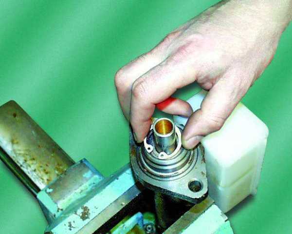 Снимите все старые резиновые уплотнители с поршней. Промойте поршни водой и просушите сжатым воздухом. Установите новые уплотнители из ремкомплекта. Перед установкой обязательно смажьте их тормозной жидкостью, это облегчит их посадку на место и предотвратит повреждение. Не перепутайте направление установки манжет. Перед сборкой ГТЦ промойте его корпус водой с моющими средствами, просушите сжатым воздухом и обильно смажьте тормозной жидкостью. Не используйте для промывки бензин или другие нефтепродукты, если вы некачественно смоете их, то они разъедят резиновые уплотнители. Установите на место поршни, закрутите стопорные болты, вставьте задний сальник и стопорное кольцо.