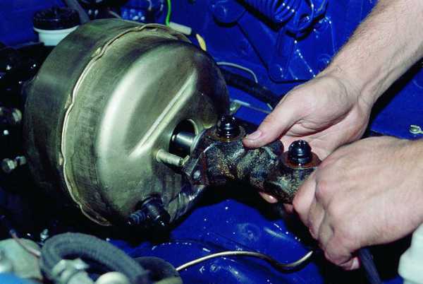 Технология демонтажа ГТЦ на любом автомобиле одинакова. Сначала шприцем откачивают тормозную жидкость из бачка (бачок можно снимать как на машине, так и после демонтажа ГТЦ). Затем с помощью специального ключа откручивают наконечники тормозных трубок (желательно сразу же надеть на них резиновые колпачки). После этого откручивают гайки крепления ГТЦ к ВУТ и снимают цилиндр.