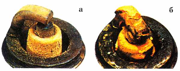 Значительные отложения на электродах, тепловом конусе изолятора и на ободке корпуса свечи могут быть в виде шлака или в виде рыхлого легко отлетающего осадка. Основной причиной является наличие непредусмотренных инструкцией по эксплуатации двигателя присадок в моторном масле или топливе. По калильному числу свеча подобрана правильно. Если очистка свечи не дает результата, ее следует заменить (См. Рис.1-б).