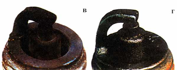 Тепловой конус изолятора, электроды и ободок корпуса покрыты бархатистым матово-черным нагаром. Причинами могут быть неисправности в системе питания двигателя (карбюраторе или системе впрыска топлива), слишком богатая смесь, засорение воздушного фильтра; неисправность пускового устройства карбюратора или слишком длительный процесс пуска двигателя, преобладание перевозок на короткие расстояния, слишком » холодная » свеча. Вследствие образования такого нагара возможны пропуски искрообразования и затруднение пуска холодного двигателя. Увеличивается расход топлива. Если свеча подобрана правильно, то после ее очистки и регулировки зазора, а также после устранения неисправностей в системах двигателя, она может быть вновь установлена на место (См. Рис.2-в).
