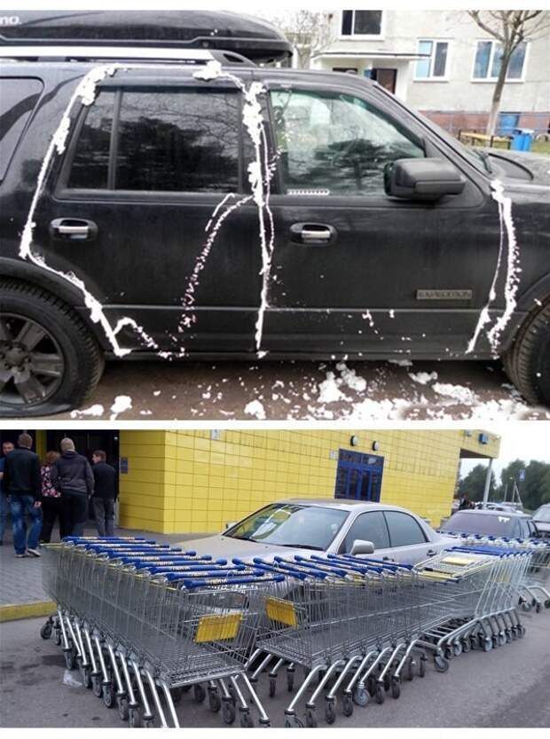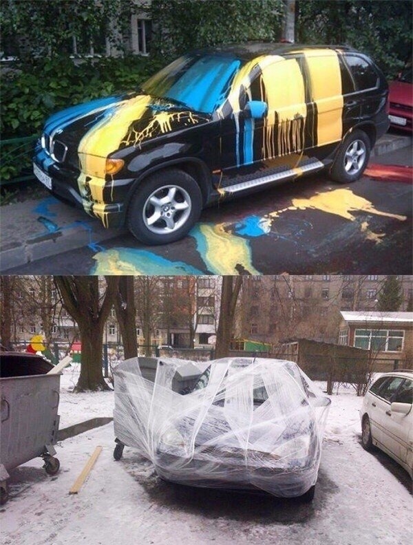 так понятней будет? большинство только злорадствовать умеют от своей жизни неудачной и смотрят в строну других с желчью. а даже уверен, что здесь дело не в машине. Для таких дел нужно ещё пойти и специально купить краску с аэрозолью, то есть подготовиться заранее. Поэтому уверен, что человек из корыстных побуждений это сделал. А за свои поступки надо отвечать, какими бы они не были, а то оправдываю. В табло получить готов за свои поступки? Тот кто это сделал в тихаря, наверняка трус. Пускай подойдёт к тому владельцу машины и скажет ему это глядя в глаза, ВОТ ЭТО Я СДЕЛАЛ. никогда не подойдёт и не скажет, так как смелости не хватит.