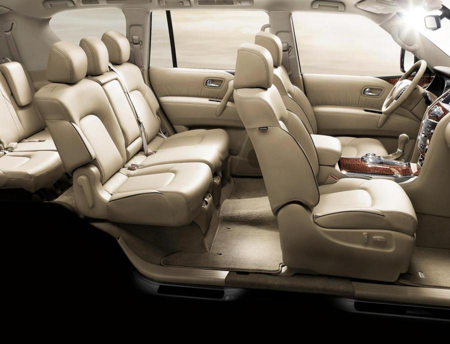 Уютный и просторный салон дополняет стильный внешний вид Armada. Его кабина хорошо изолирована от внешнего шума, а большинство материалов привлекательны и мягки. Armada имеет три ряда сидений и может вместить до восьми пассажиров, но вместимость снижается до семи с дополнительными капитанскими креслами второго ряда. Они легко и быстро складываются с помощью ручки, которая выдвигает сиденье вперед; Однако переустановка сиденья должна выполняться вручную. Складывающийся третий ряд (стандартный для SL и выше) можно поднимать и опускать с помощью кнопок в багажном отделении или на подлокотниках третьего ряда, но улитки двигаются быстрее.