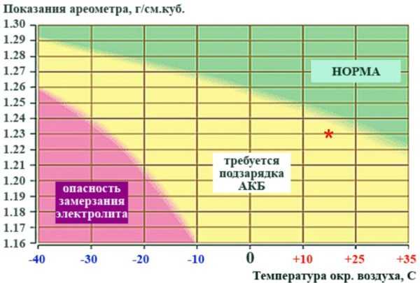 Таким образом, если Вы измеряете плотность зимой во время легкого заморозка (до -10), то у заряженного аккумулятора она должна составлять 1,3-1,32 г/см3, так как с поправкой -0,02 мы и получим «стандартные» 1,28-1,3. На жаре же уже нормой плотности будут 1,27-1,29 г/см3.