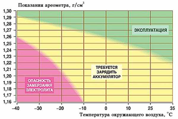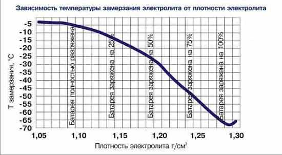 При нормальных условиях (под которыми в физике принято понимать, среди прочего, температуру +20° С) плотность электролита в полностью заряженном аккумуляторе составляет 1,28-1,3 г/см3. Как можно видеть на приведенной иллюстрации, именно такая плотность обеспечивает наибольшую морозоустойчивость. Заодно заметно, что у полностью разряженного аккумулятора риск замерзания зимой очень велик – достаточно температуре опуститься ниже -5, как в электролите образовываются кристаллики льда.