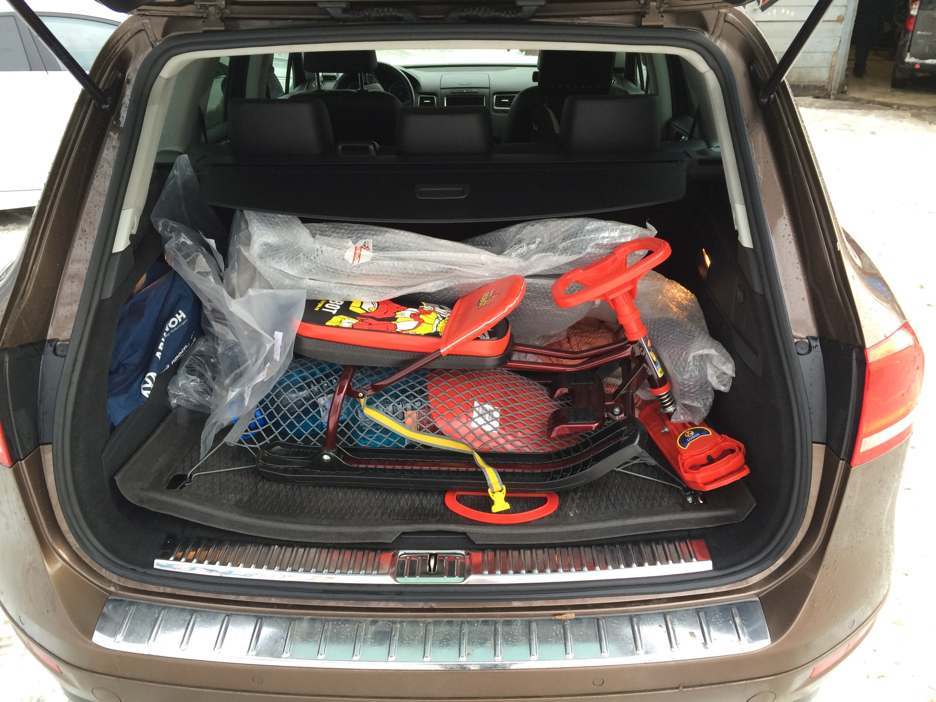 Проектируя багажное отделение Фольксваген Туарег, немецкие инженеры не стали просто копировать оборудование Шкоды, а предложили свою версию оснащения. Всякой мелочевкой, вроде мелких емкостей и карманчиков заморачиваться не стали.