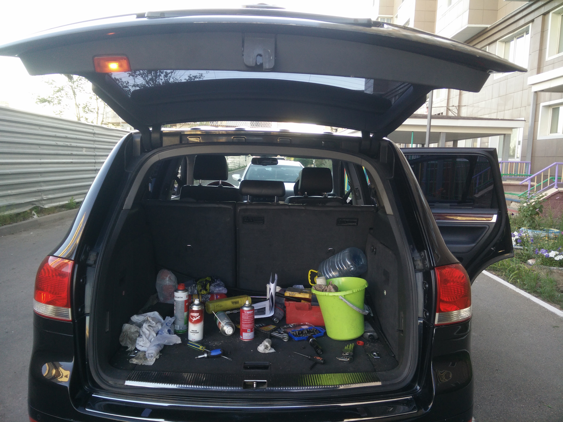В нишах под полом багажного отделения расположено стандартное оборудование: домкрат, набор инструмента и «хитрая докатка«. В некоторых комплектациях многочисленные емкости под фальшполом, ближе к задним сидениям, будут заняты оборудованием 48-вольтовой вспомогательной сети Туарега и использовать их для багажа не получится.