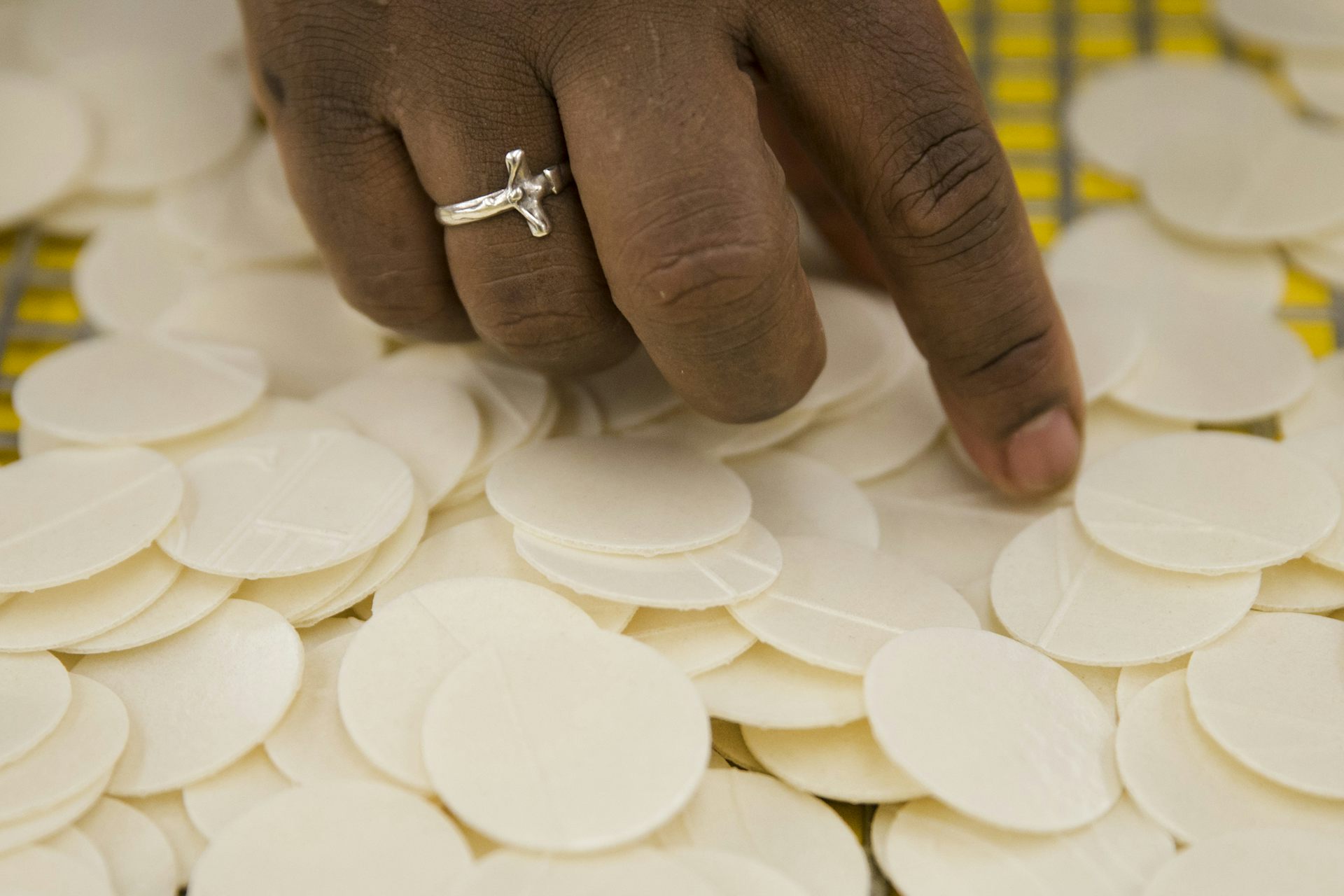 мучной, клеевой или бумажный на клею кружек, для печатки писем. католиков круглый листок из пресного теста, образующий приношение, вид тела Христова, Св