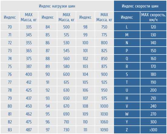 А также у грузовых шин большое количество индексов максимальных нагрузок и скоростей, поэтому лучший выход — таблица.
