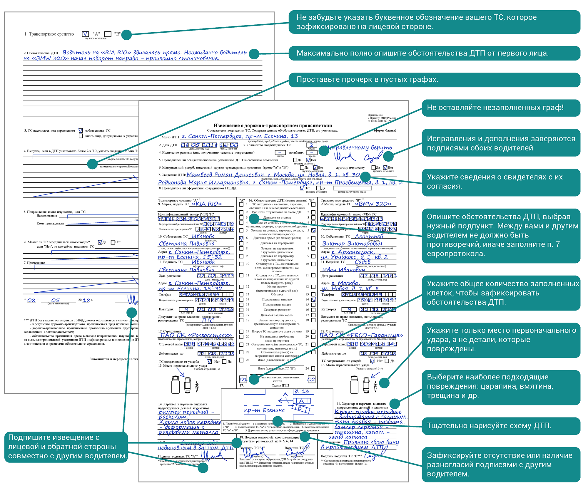 Используйте только один комплект бланков при 2-х участвовавших в ДТП транспортных средствах. Не важно, кто из участников ДТП предоставит комплект бланков или выберет колонку А или В.