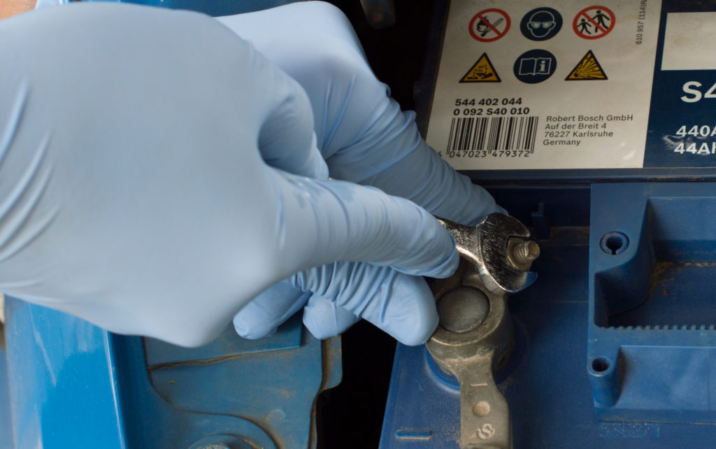 - С помощью подходящего по размеру ключа ослабьте отрицательную клемму и снимите ее с аккумулятора. Только после этого освобождаем и убираем «плюс».