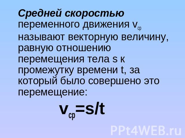 Для характеристики неравномерного движения вводят понятие средней скорости. Средняя скорость тела при неравномерном движении находится так же, как и скорость при равномерном движении, т. е. весь пройденный телом путь необходимо разделить на полное время движения тела, включая остановки.