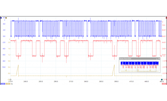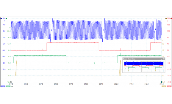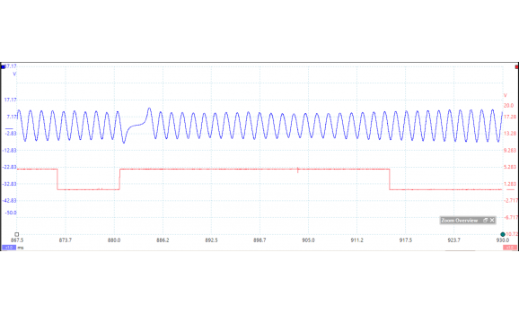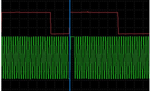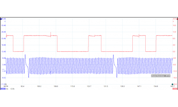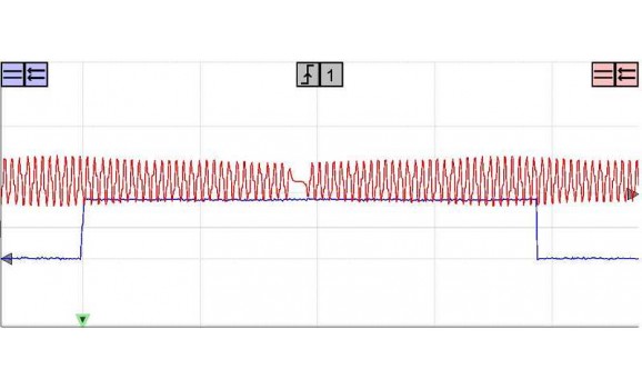 Канал 1 (красный) показывает напряжение сигнала датчика распредвала. Стартер издает сильный шум при прокручивании коленчатого вала. Этот шум не влияет на работу системы управления двигателем. Точная амплитуда также не очень важна. Системы управления двигателем используют спадающие фронты напряжения сигнала для определения положение двигателя.