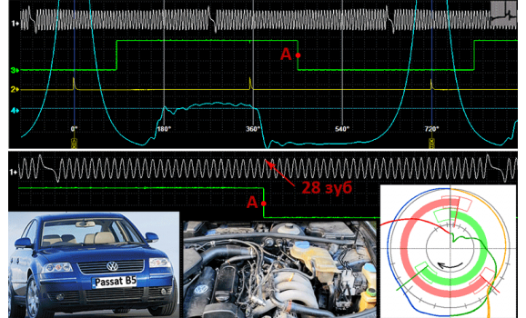 Большинство сигналов коленчатого вала имеют область кольца, где зубья разнесены или имеют другой размер. Невозможно сказать, указывают ли они на верхнюю мертвую точку или на другое событие. Но они могут помочь вам определить 720 градусов вращения коленчатого вала. За это время вы увидите один оборот распределительного вала.