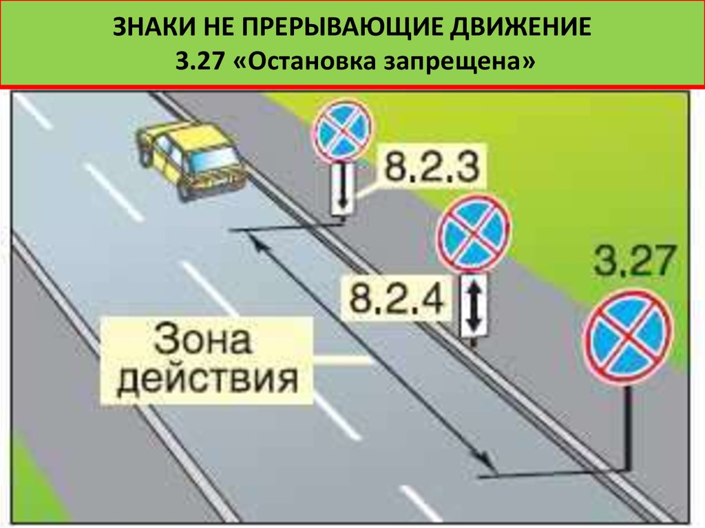 Знак 3.27 «Остановка запрещена» и зона его действия