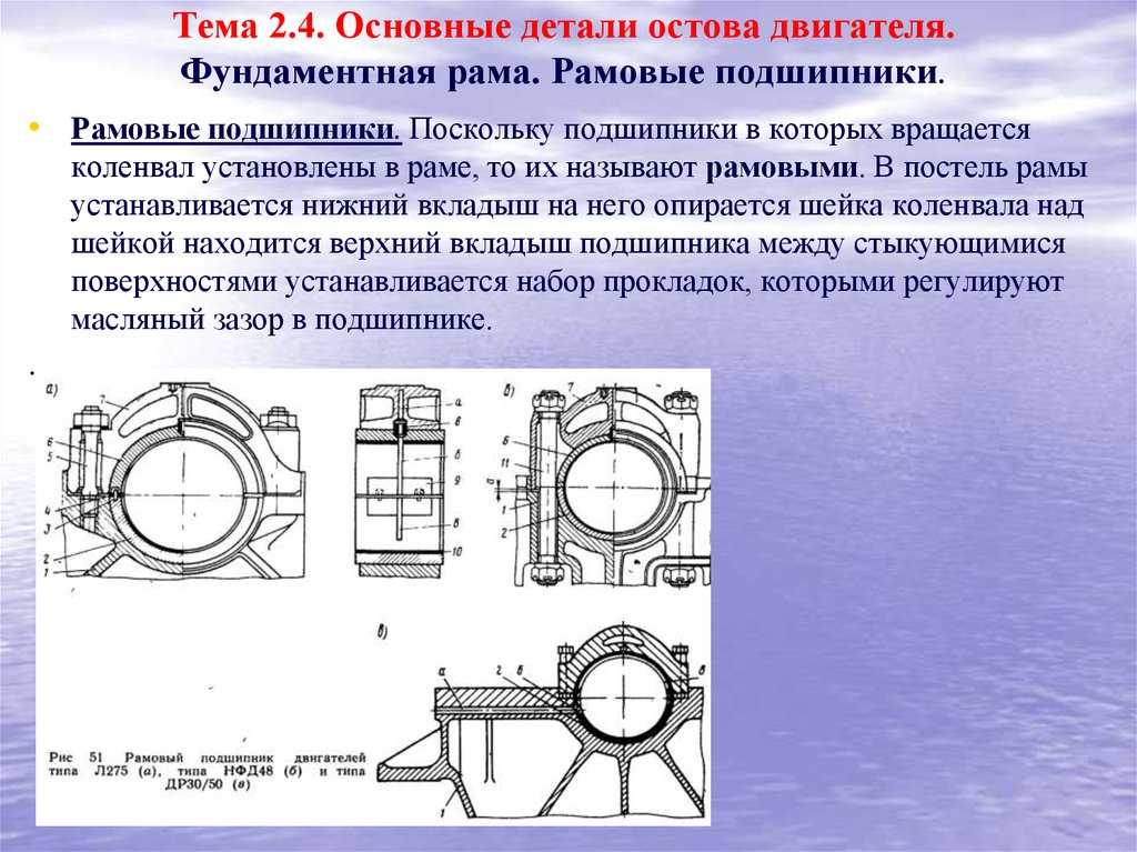 Рамовые подшипники служат опорой коленчатого вала и воспринимают усилия, передаваемые шатуном фундаментной раме. Рамовый подшипник показан на рисунке: