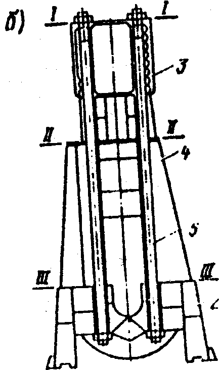 У вертикального однородного тронкового двигателя (рис.2, а) остов состоит из фундаментной рамы 2 и блок-картера I и имеет: плоскости разъема: I-I — между блоком и крышками цилиндров;