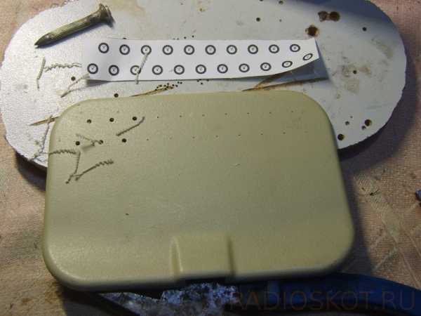 Далее всё очень просто: вырезаем шаблон, приклеиваем его на пластиковую деталь клеем «карандаш», предварительно выровняв его по месту. Намечаем центра отверстий чем ни будь острым (я использовал строительный дюбель). Снимаем шаблон и аккуратно сверлим отверстия, сначала маленьким сверлом (2 – 2,5 мм), затем нужного размера (4,7 – 5 мм).