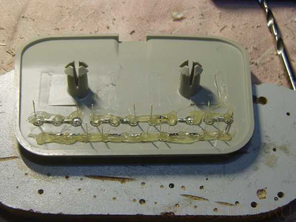 Затем устанавливаем светодиоды в посадочные места, сориентировав их ноги так, что бы удобно было спаивать последовательно по три штуки, и заливаем всё это термоклеем.