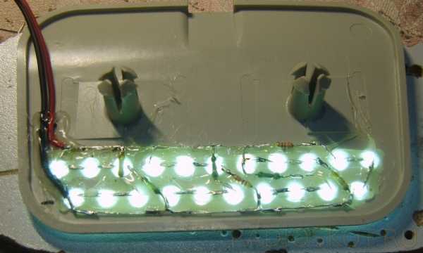 Замечательное решение данного вопроса, при помощи светодиодов можно существенно улучшить освещение салона автомобиля. Специальные комплекты подсветки можно без труда купить практически в любом автомагазине. В такие комплекты входят два ярких светодиода со встроенными линзами, крепятся они при помощи компактных кронштейнов с клейкой основой.