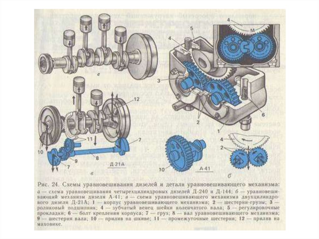 1 — полумуфта отбора мощности; 2 — стопорная шайба носка коленчатого вала; 3 — передний противовес; 4 — ведущая шестерня привода масляного насоса; 5 — заглушка полости шатунной шейки; 6 — задний маслоотражатель; 7 — распределительная шестерня; S — задний противовес; 9 — полукольца упорного подшипника коленчатого вала; 10 — крышка коренного подшипника коленчатого вала; 11 — вкладыш коренного подшипника коленчатого вала