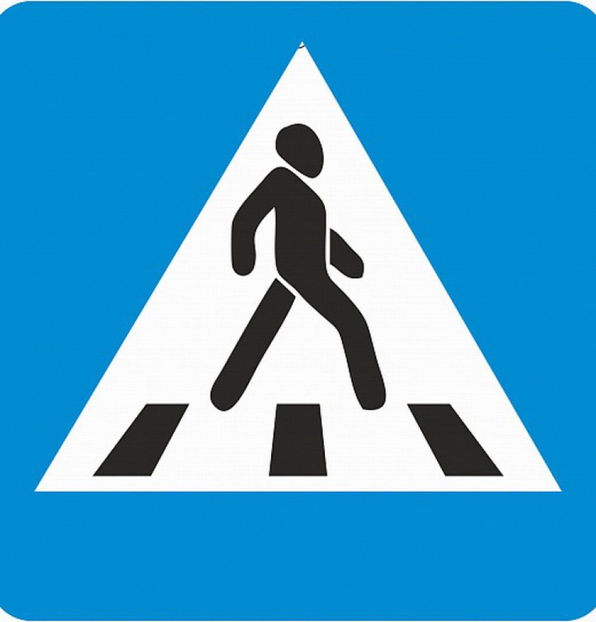 Знак 5.19.1 представляет собой синий квадрат с белым треугольником, на котором схематично изображен пешеход, переходящий дорогу. Требования дорожного знака не распространяются на спецтранспорт с включенными проблесковыми маячками.
