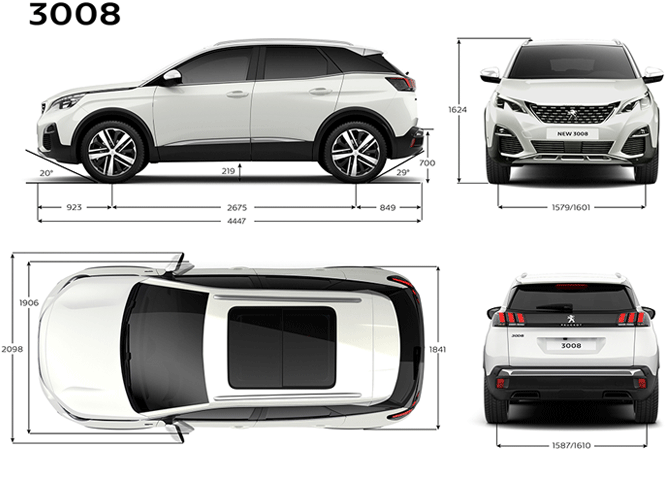 Модель 3008 имеет размеры 1624 мм (63,9 дюйма) в высоту, 4447 мм (175,1 дюйма) в длину, 1826 мм (71,9 дюйма) в ширину с колесной базой 2675 мм (105,3 дюйма), что дает в общей сложности 1371 кг (3022,5 фунта) собственного веса. . В стандартную комплектацию 3008 GT LINE входят шины 225/55 R18 спереди и 225/55 R18 сзади. Требуется обслуживание каждые 12 месяцев или 20 000 км, в зависимости от того, что наступит раньше. Гарантия 60 месяцев без ограничения пробега.