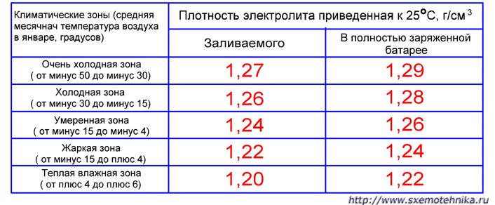 - Для северного региона с температурой от -15 до -30 это 1,26 и 1,28 г/см3 для заливаемого электролита и при полностью заряженной батарее соответственно.